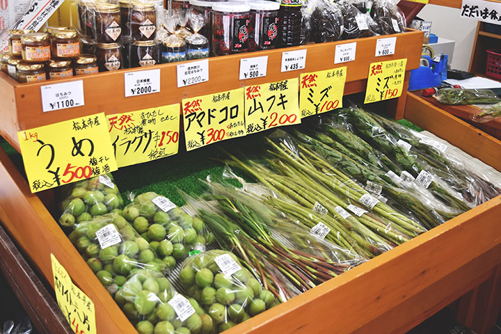 地元で採れる山里の恵み 春は天然の山菜が豊富に並びます