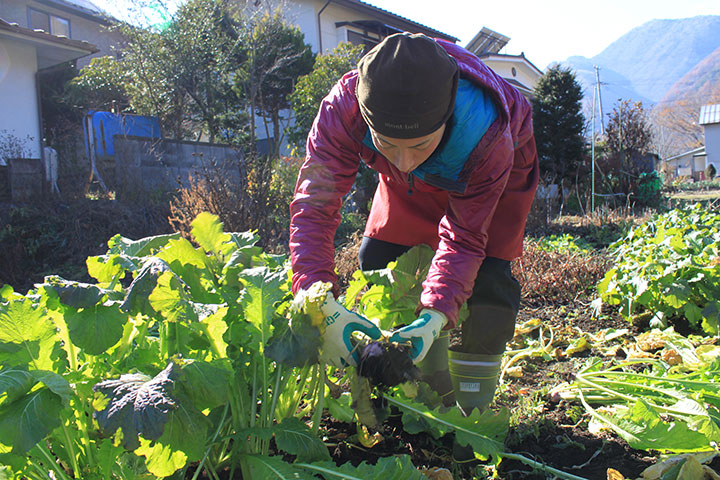 稲核菜は初秋にタネ播きし、霜にあたって旨味が出る11月中旬に収穫し、漬け込んでいきます。収穫~漬け込みの時期は、昔から地域総出の大仕事!また、稲核菜は交配しやすいので、地域に古くから残る原種を守るため、細心の注意を払っています。稲核菜は、この地域で手をかけて守り育てられてきた、大事な食材なんです。